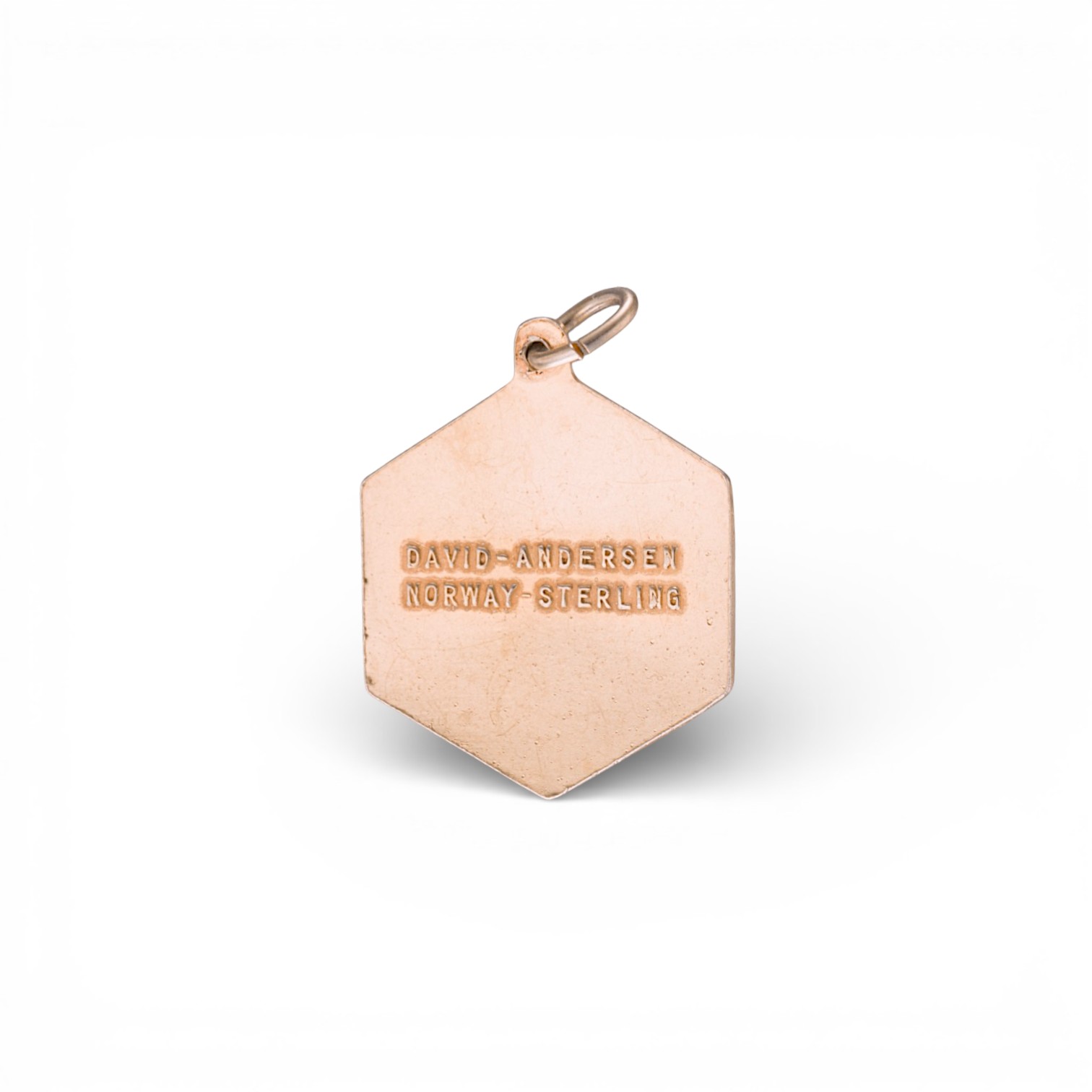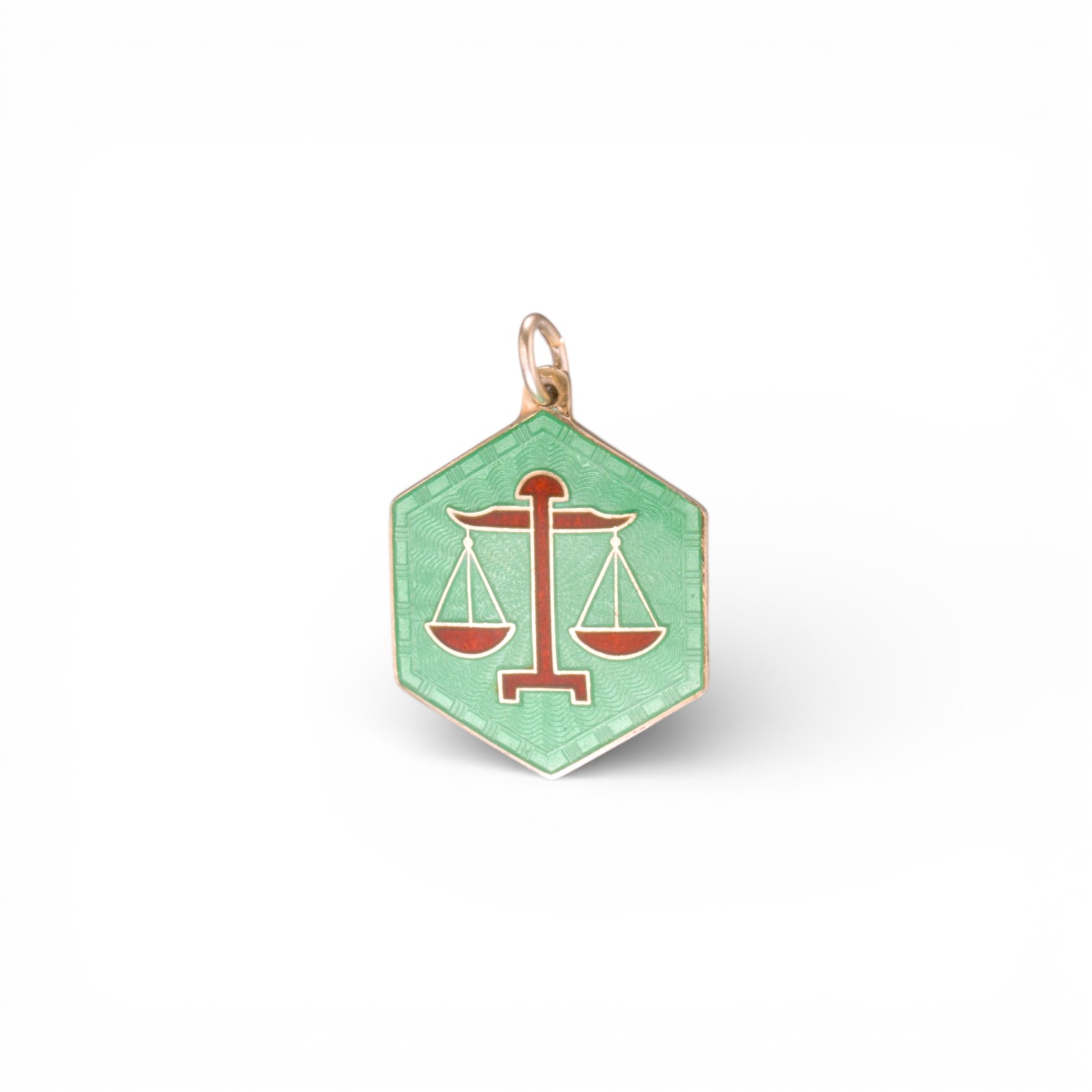 Anheng i sterling sølv med grønn og rød emalje. Vekten stjernetegn. David-Andersen. Oslo. 1900-tallets andre halvdel.